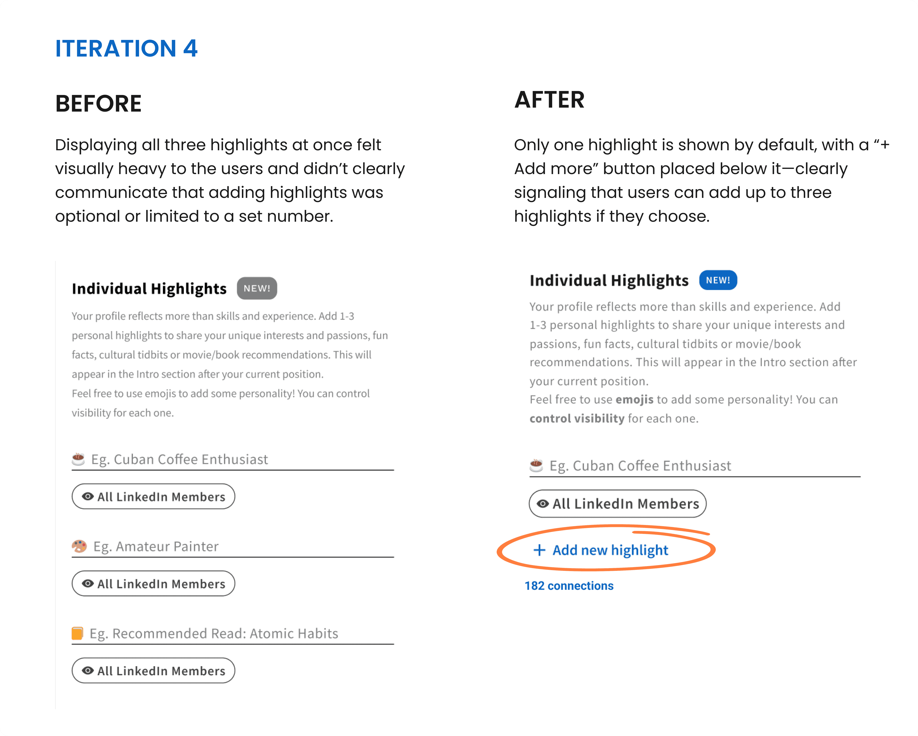 ❌ Users suggested displaying a single highlight by default, with an 'Add more' button beneath it.