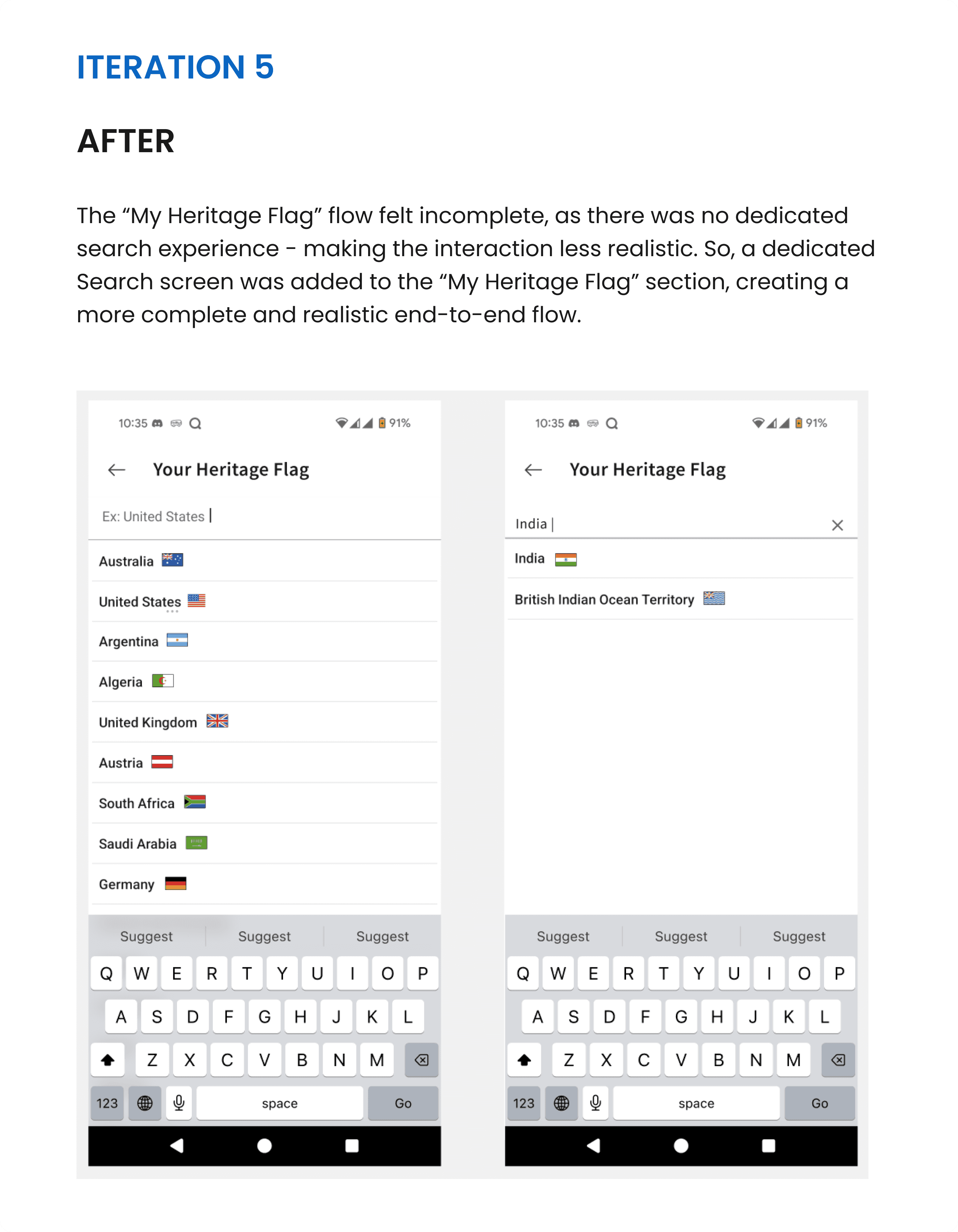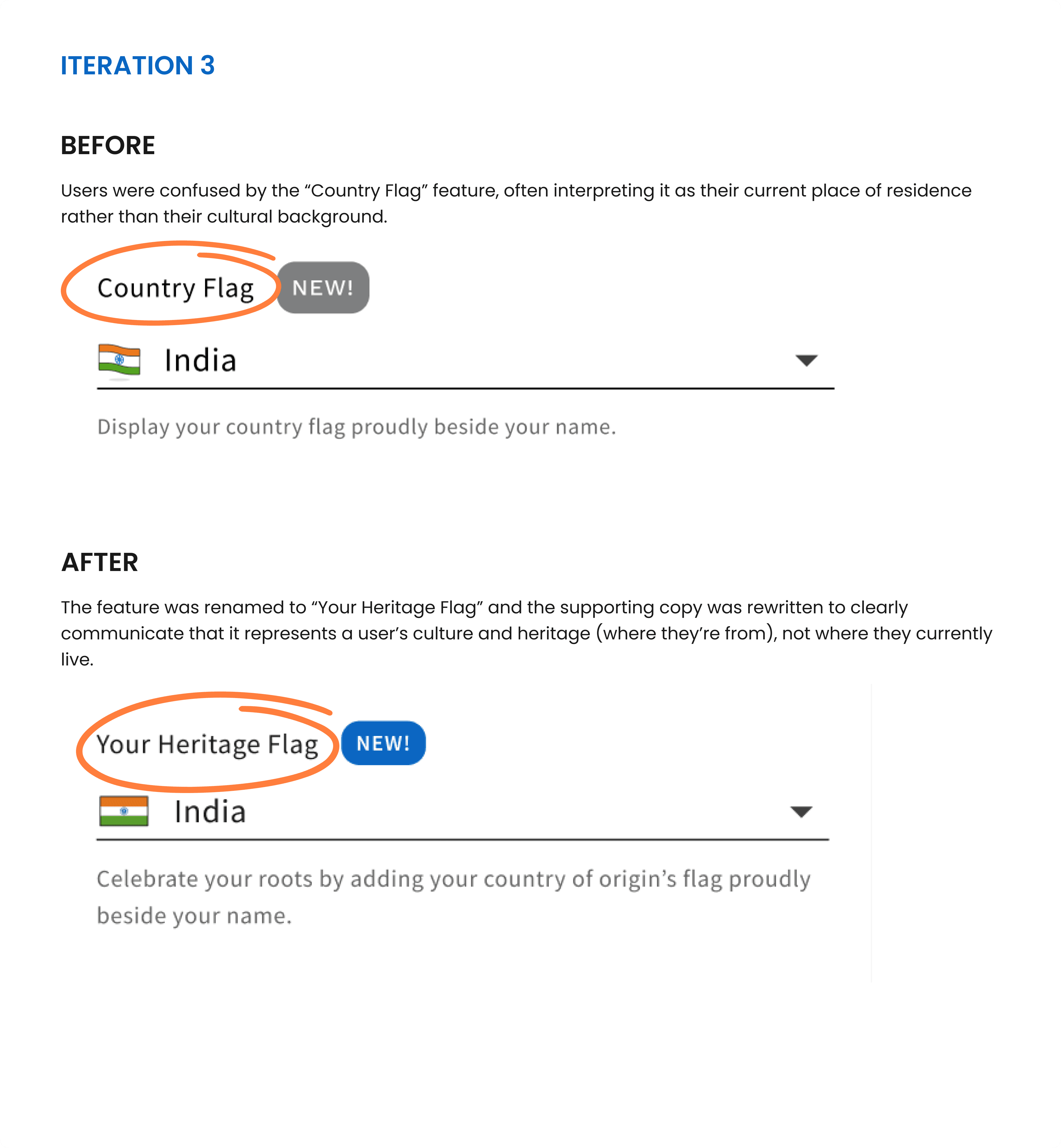 I simplified navigation flows, refined copy and terminology (especially in modals and the Country Flag section), and adjusted visual hierarchy - spacing, typography, placement - so the feature felt native to the platform.