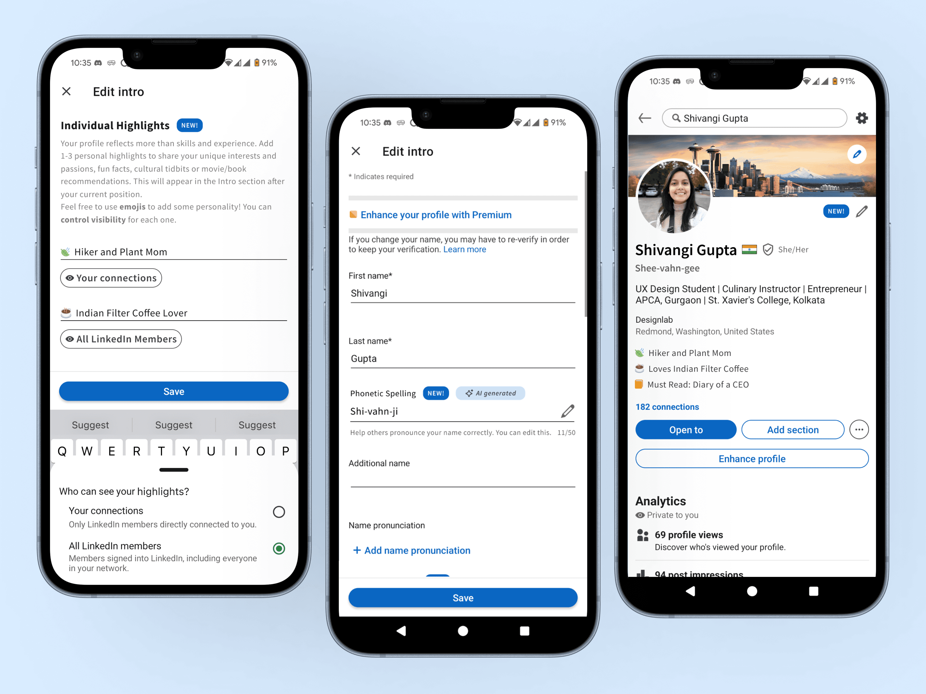 Share interests and experiences that shape you individually and professionally - making LinkedIn profiles feel human.