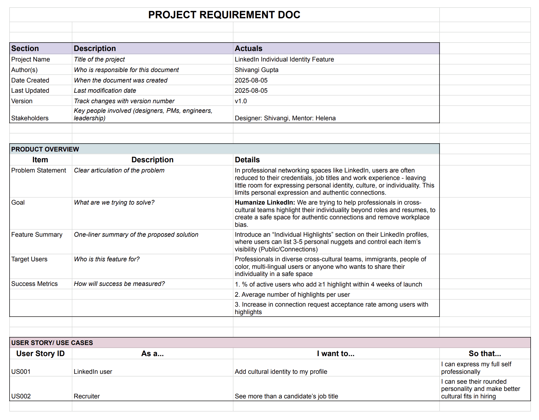 I created a Project Requirement Doc (PRD) - a real-world document used in corporate settings - to capture Core problem statement, Feature goal and summary, Target users, Success criteria and Technical considerations (where it lives, visibility controls, etc.)
